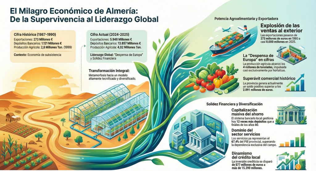 Lo cierto es que echando la vista atrás, y más allá de cuestiones políticas, basta mirar la Almería de hace medio siglo y la de ahora para comprobar lo bien que le ha sentado en todos los aspectos. No es que no tenga déficit, que los tiene, como la propia Andalucía, pero la trayectoria socioeconómica de Almería durante las últimas décadas representa uno de los procesos de modernización más intensos de todo el Estado español. Según los datos recopilados por el Instituto de Estadística y Cartografía de la Junta de Andalucía, la provincia ha experimentado una metamorfosis integral que afecta desde su estructura productiva hasta su capacidad financiera.