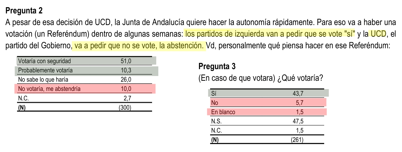 El estudio demoscópico se caracterizó por utilizar un cuestionario con preguntas marcadamente inductivas, diseñadas en un contexto donde el partido en el Gobierno, la Unión de Centro Democrático, promovía activamente la abstención desde Madrid, aunque en Andalucía se movía precisamente en sentido contrario, reclamando el Sí al artículo 151, como el resto de formaciones andaluzas.