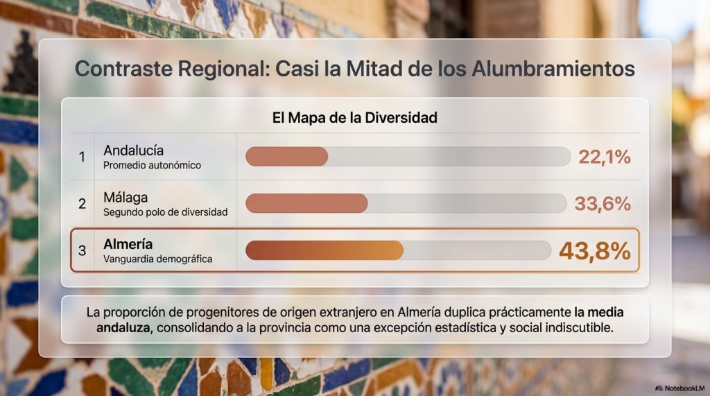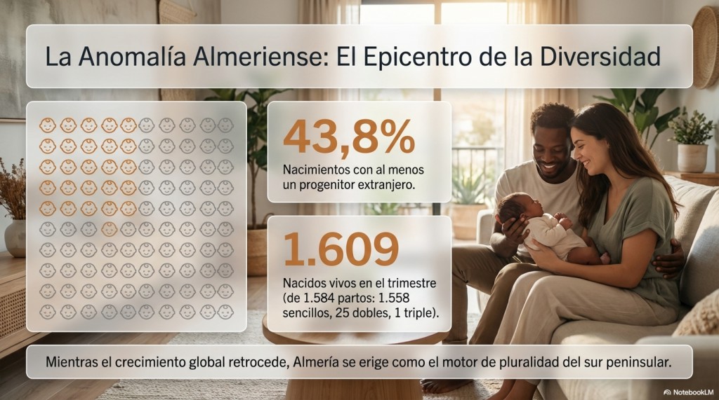 La provincia de Almería se ha situado a la vanguardia de la diversidad demográfica en Andalucía durante el tercer trimestre de 2025. Según los datos del Movimiento Natural de la Población, el 43,8% de los nacimientos registrados en territorio almeriense contaron con al menos un progenitor de origen extranjero, una cifra que supera significativamente la media de Andalucía, situada en el 22,1%, y que coloca a la provincia por encima de Málaga, donde este porcentaje alcanzó el 33,6%. En términos absolutos, la provincia contabilizó un total de 1.584 partos que dieron lugar a 1.609 nacidos vivos, de los cuales 1.607 superaron las primeras 24 horas de vida.