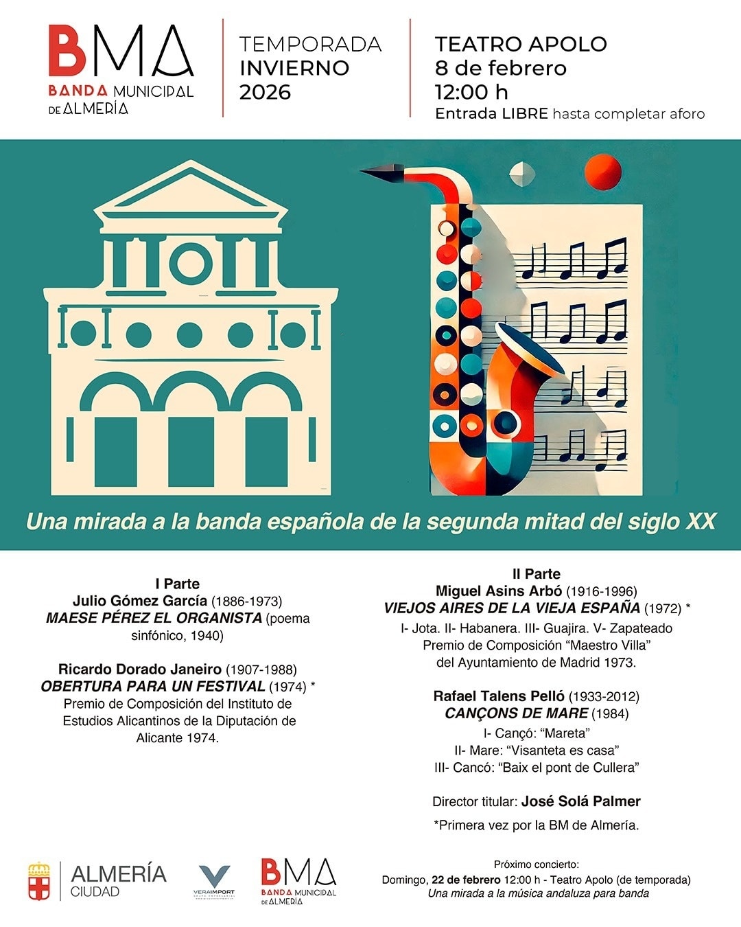 La agenda de la Banda no se detendrá tras esta actuación. El calendario de febrero se completará el día 22 con un programa dedicado íntegramente a la identidad musical de nuestra región como antesala al Día de Andalucía. En dicha ocasión, el Teatro Apolo se llenará de acordes de autores tan emblemáticos como Manuel López Farfán o José Faus Rodríguez. Posteriormente, el ciclo de invierno cerrará el 8 de marzo con una incursión en el repertorio norteamericano contemporáneo, antes de dar paso a las tradicionales citas del Ciclo de Música Sacra que recorrerán los templos de la capital almeriense durante la segunda quincena de marzo.
