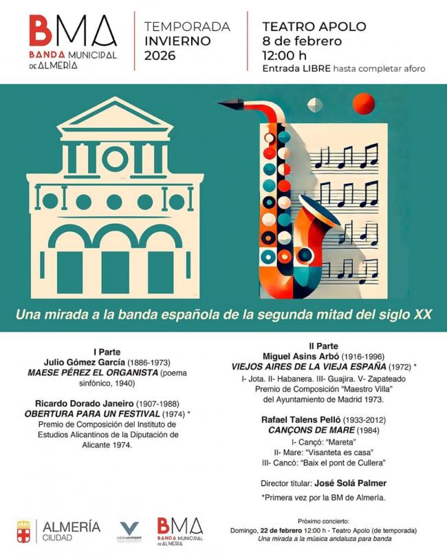 La música de raíz española volverá a resonar con fuerza en el corazón de Almería. Este próximo domingo, 8 de febrero, la Banda Municipal de Música regresa a su cita matinal en el Teatro Apolo para ofrecer el segundo gran encuentro de su programación invernal. Tras un inicio de año de intensa actividad, que incluyó una reciente colaboración solidaria con el coro infantil de Adra y la agrupación San Indalecio, la formación liderada por el maestro José Solá Palmer propone ahora un viaje sonoro por la creación sinfónica nacional de la segunda mitad de la pasada centuria.