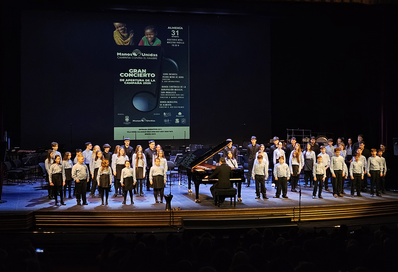 El Auditorio Municipal Maestro Padilla registró una entrada excepcional para asistir a un evento que fusionó la excelencia vocal del Coro Infantil Pedro Mena con la potencia instrumental de la Banda Municipal de Almería y la Agrupación San Indalecio, logrando una recaudación destinada a proyectos de desarrollo internacional.