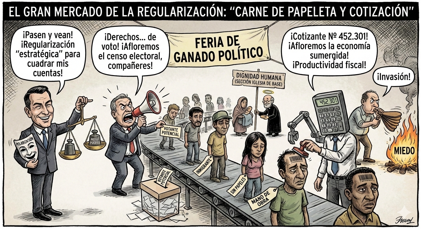 El debate sobre la regularización de personas extranjeras en el Estado español ha vuelto a salir del congelador, no por una súbita epifanía humanista de nuestra clase política, sino porque los números —ya sean de cotización o de papeletas en una urna— empiezan a no cuadrar. Resulta fascinante, por no decir dantesco, observar cómo la Iniciativa Legislativa Popular (ILP) para la regularización extraordinaria de más de 500.000 personas se ha convertido en una subasta de ganado ideológico donde el sujeto, el ser humano que ya vive y respira en esta provincia de Almería, es lo de menos.