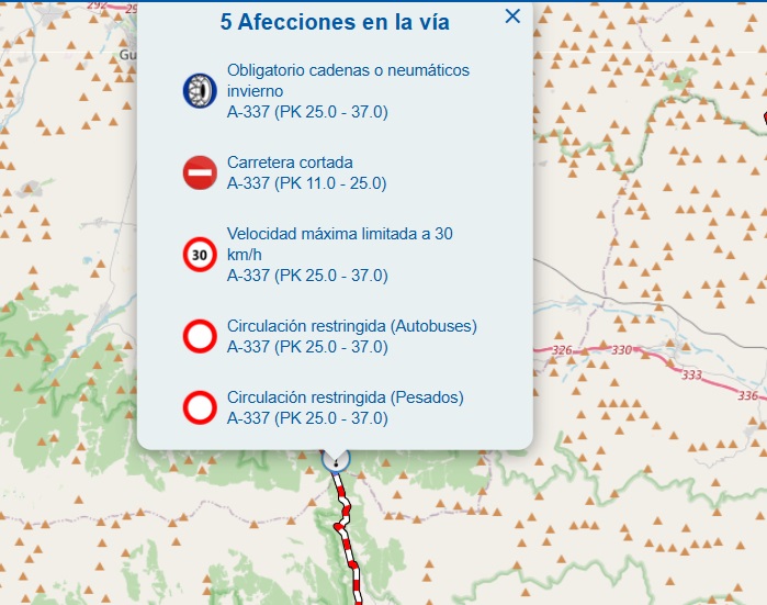 Según información reciente de la DGT (Dirección General de Tráfico), en actualizaciones previas del fin de semana, la A-337 en esta zona ya presentaba restricciones por nieve (como obligación de cadenas o intransitable en tramos), y el corte total coincide con el empeoramiento del temporal.