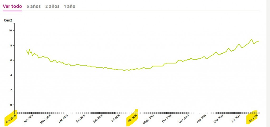 Otras provincias como Granada y Córdoba aparecen en contextos históricos, pero en datos antiguos (2023), Granada capital tenía 9,1 €/m² con subidas del 2,1% mensual. Córdoba mostraba estabilidad o bajadas leves en periodos pasados. Jaén, con datos más recientes para su capital, alcanza 7,6 €/m² en enero 2025, con +0,6% mensual y +10,5% anual.