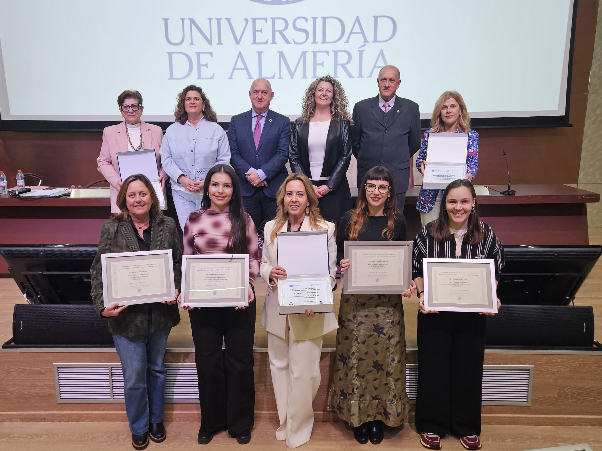 El inicio lo han marcado los mejores expedientes de la promoción de Grado 2021/2025. En el de Psicología ha destacado Estela María Martín y en el de Trabajo Social ha brillado Andra Lorena Vladescu. Respecto a los másteres, los mejores expedientes de la promoción 2024/2025 han sido los siguientes: en Investigación en Ciencias del Comportamiento, el de Noelia Gomis, en Psicología Educativa, el de María Gómez, y en Psicología General Sanitaria, el de Laura Gómez. Se ha pasado al apartado de placas de la Facultad de Psicología a los 25 años de Servicio, reconociéndose la labor profesional de María Teresa Daza. En el siguiente bloque, el de distinciones a entidad privada y a entidad pública por su destacada labor colaborativa al servicio de la Facultad, la primera ha sido para Feafes Almería Salud Mental ‘El Timón’, mientras que la segunda se ha entregado al Área de Familia, Inclusión e Igualdad del Ayuntamiento de Almería.