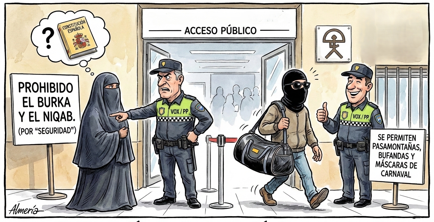 Vayamos a los datos y dejemos la demagogia para los mítines. La iniciativa pretende vetar vestimentas concretas asociadas a una religión específica. Y ahí radica la trampa y la inconstitucionalidad. Si el objetivo real fuera la seguridad ciudadana —un argumento que cualquier persona sensata podría comprar—, la ley sería aséptica y universal. Bastaría con una norma que impidiera el acceso a edificios o espacios públicos con el rostro oculto, independientemente de si lo que te tapa la cara es una tela religiosa, un casco de moto, una bufanda del Unión Deportiva Almería o un pasamontañas comprado en el Decathlon.