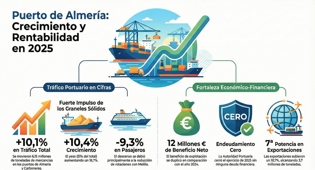 Estas cifras provisionales de cierre de año respecto al tráfico de mercancías, situándose por encima de los 6,1 millones de toneladas, coinciden con las previsiones que la APA trasladaba en la reunión de su último Consejo de Administración celebrado en diciembre. En este encuentro, la presidenta Rosario Soto también adelantó la situación económico-financiera referente a 2025, año que la Autoridad Portuaria de Almería cerraría con un endeudamiento cero y un beneficio neto de 12 millones de euros: 4 millones provenientes de explotación, duplicando la cifra de 2024, y 8 millones de la extinción de la concesión de mutuo acuerdo con Endesa respecto a las instalaciones portuarias en Carboneras.