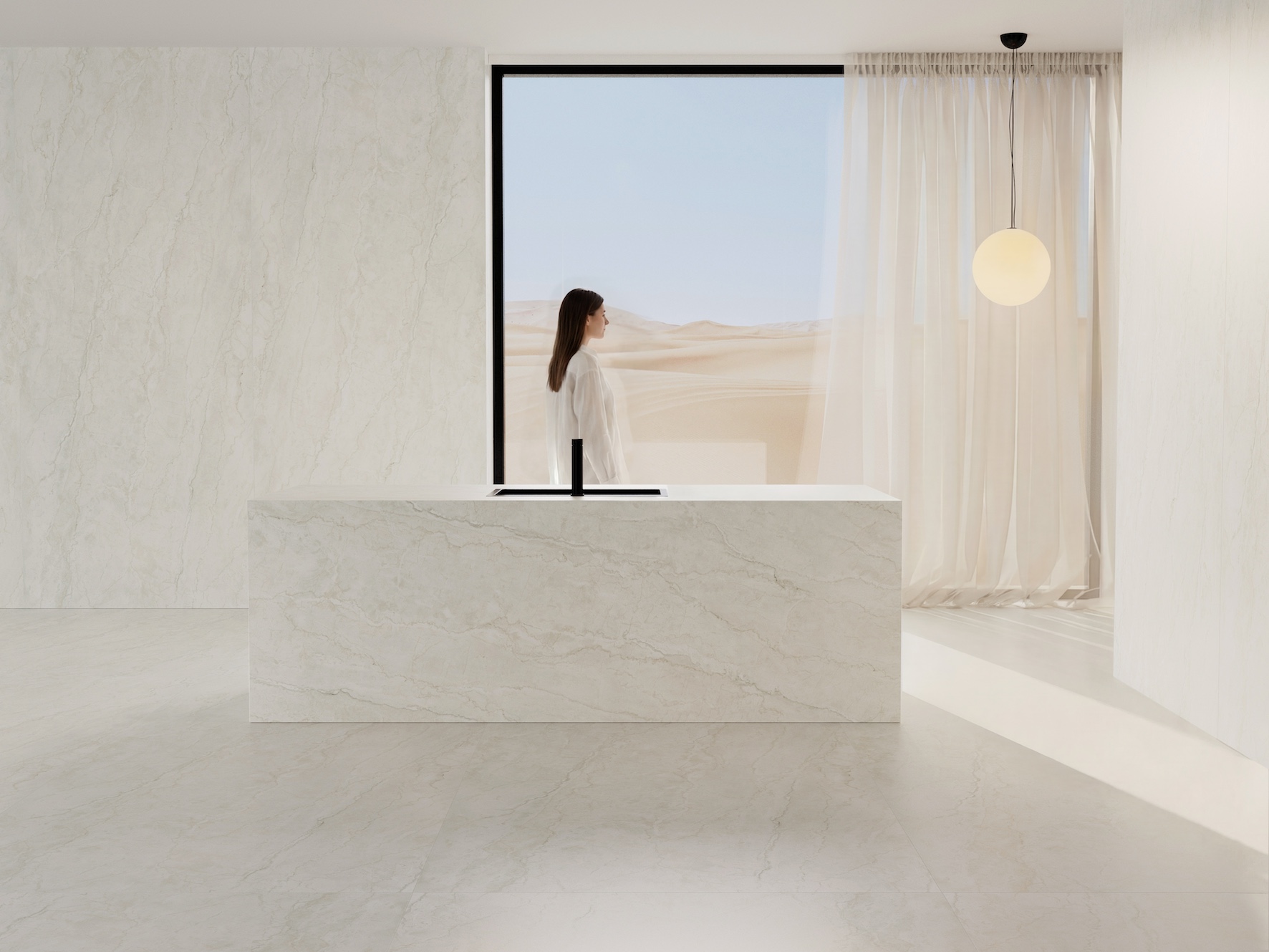 • THALA: Tono marfil de vetas arena que aporta una calidez contenida. Favorece su uso tanto en entornos modernos como en líneas más orgánicas combinado con maderas medias o cerámicas mate.