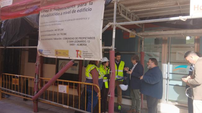 La delegada territorial de Fomento, Articulación del Territorio y Vivienda en Almería, Dolores Martínez, ha visitado las obras de rehabilitación energética que se están ejecutando en dos edificios residenciales de la capital almeriense. Durante la visita ha estado acompañada por el arquitecto técnico y agente gestor de la rehabilitación de ambos inmuebles, Jesús Lara Crespo-López, así como por representantes de las dos comunidades de propietarios beneficiarias de estas ayudas.