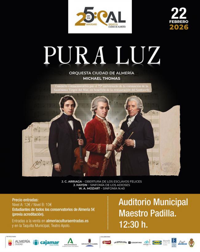 Para tan importante cita del 22 de febrero en honor a la Patrona de Almería, la Virgen del Mar, la OCAL contará con la dirección de Michael Thomas y el programa incluirá las obras ‘Obertura de los esclavos felices’, de J.C. Arriaga, ‘Sinfonía de los adioses’ de J. Haydn, y la ‘Sinfonía nº40’ de Mozart.