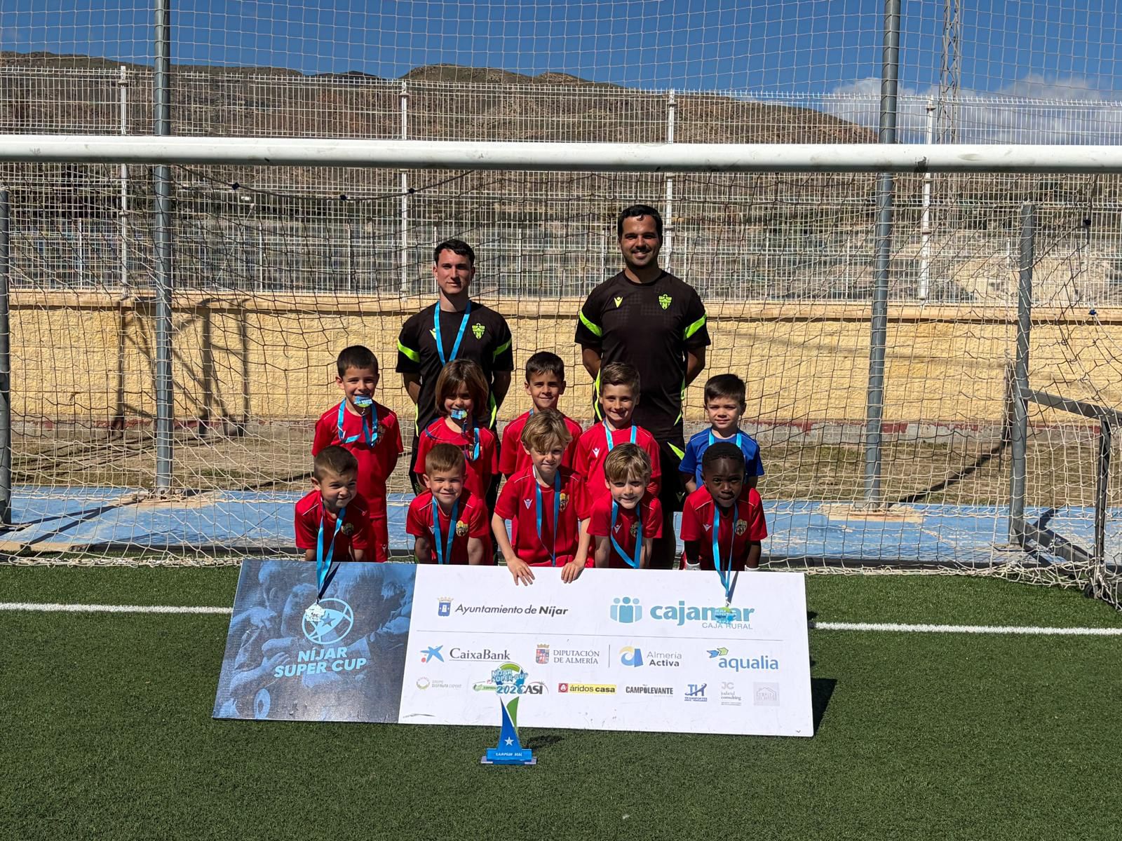 La Unión Deportiva Almería ‘B’ se ha proclamado campeona de la Níjar Super Cup 2026 en categoría bebé, tras una brillante actuación en el torneo celebrado el domingo en el Campo de Fútbol Villa de Níjar. El equipo campeón, dirigido por sus entrenadores Diego Antonio Hernández y Juan Carlos Rodríguez, ha estado formado por Bruno López, portero; los defensas Mateo Reina y Marco Fernández; el centrocampista Mateo Ballesta; los extremos Javier Osorio y Pablo Berenguel; y los delanteros Dylan Fuentes, Diego Cid, Lucas Rodríguez y El Basir Touray.