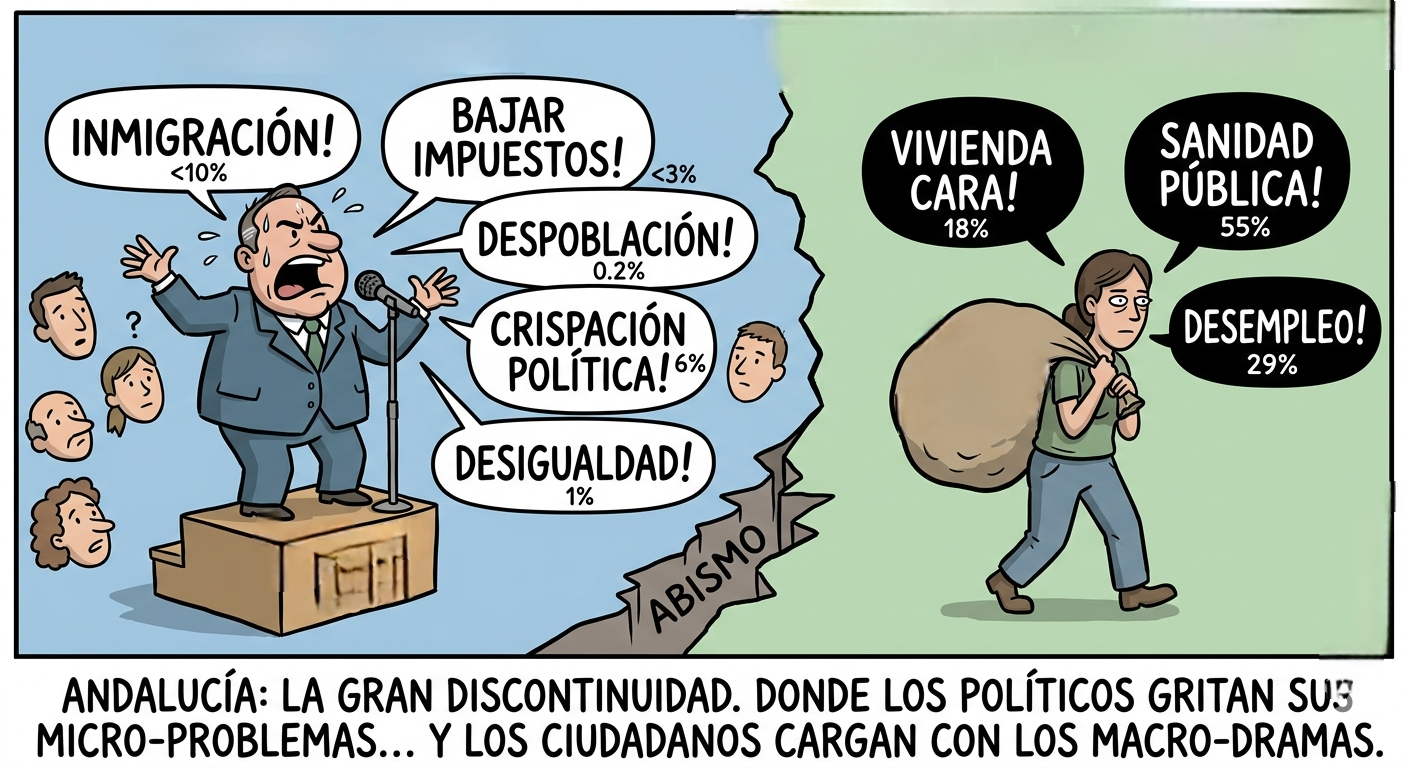 Llegaremos al 17 de mayo con los oídos llenos de promesas sobre "inseguridad ciudadana" (problema para el 2%) o servicios sociales (2%), mientras los problemas de calado real siguen ahí, esperando a que alguien deje de mirarse el ombligo partidista. Al final, lo de votar en Andalucía se está convirtiendo en un ejercicio de fe: creer que lo que el político dice que te preocupa es, efectivamente, lo que no te deja dormir. Sigan circulando, que aquí no pasa nada, o al menos eso dicen sus encuestas.