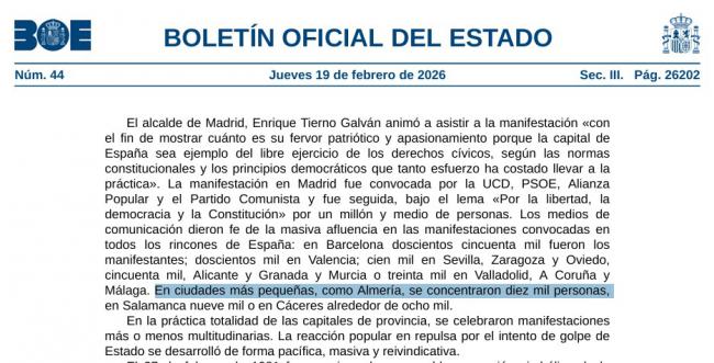 El acuerdo firmado por el almeriense Fernando Martínez López también establece que el Portal web de la Secretaría de Estado recogerá fichas con material gráfico y audiovisual para recordar el fervor patriótico y cívico con el que se defendieron los derechos fundamentales. Asimismo, se desarrollarán mecanismos institucionales para integrar este reconocimiento en circuitos internacionales de memoria democrática, asegurando que la respuesta de los 10.000 almerienses y del resto de ciudadanos del Estado español sea estudiada como un ejemplo de defensa de la libertad frente a la involución. Esta declaración, que ya es efectiva tras su publicación en el BOE, garantiza que el espíritu de resistencia nacido tras el 23F permanezca vivo en el Inventario de Lugares de Memoria Democrática.