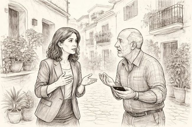 La alcaldesa de Almería dialoga con un ciudadano sobre tarjetas digitales en un barrio con casas blancas. (Foto: Imagen generada por inteligencia artificial – Cibeles AI)