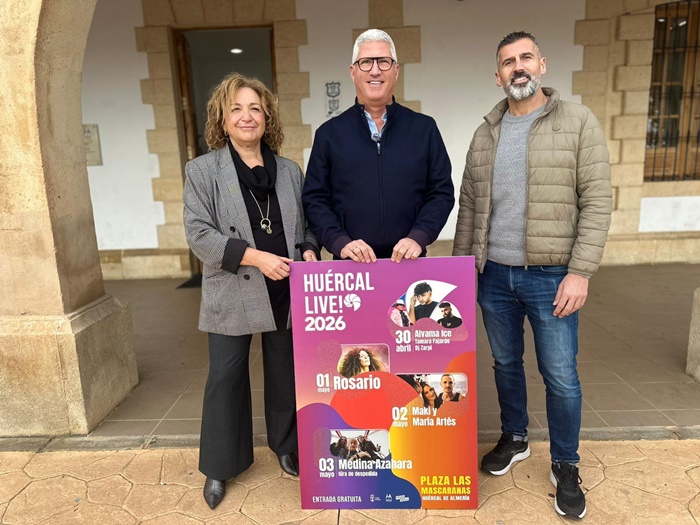 El alcalde de Huércal de Almería, Ismael Torres, ha dado a conocer este miércoles el cartel del festival ‘Huércal Live 2026’, que se celebrará del 30 de abril al 3 de mayo, coincidiendo, como es habitual, con la celebración de las fiestas patronales por el patrocinio de San José. Un cartel que este año contará con las actuaciones gratuitas de Alvama Ice, Maki & María Artés, Rosario y Medina Azahara sobre el escenario, y que se completa con los artistas locales Tamara Fajardo y DJ José Zarpi. El recinto de conciertos estará situado en la plaza de Las Mascaranas.