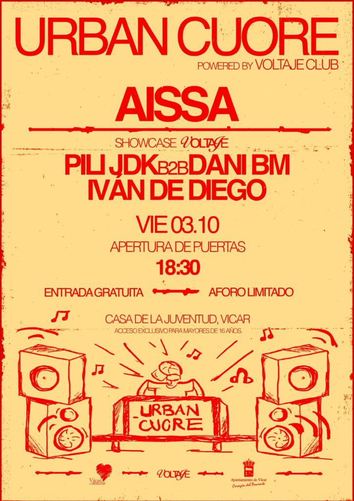 El próximo viernes 3 de octubre, la Casa de la Juventud y el Deporte de Vícar se convertirá en el epicentro de un evento musical que promete ser uno de los más destacados de la temporada. Bajo el nombre de ‘Urban Cuore’, esta fiesta contará con la participación del reconocido artista Aissa, junto a jóvenes talentos locales.
