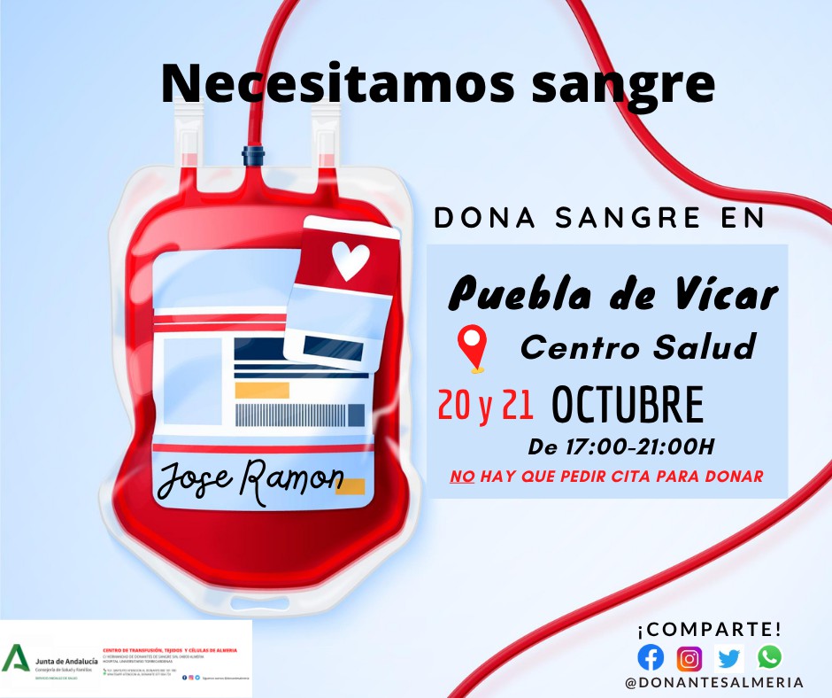 El próximo lunes y martes, el Centro de Salud de Puebla de Vícar será sede de una nueva colecta de sangre, organizada por el Centro de Transfusión Sanguínea de Almería. Las extracciones se llevarán a cabo en horario de 17:00 a 21:00 horas, con el objetivo de facilitar la donación a todos los interesados.