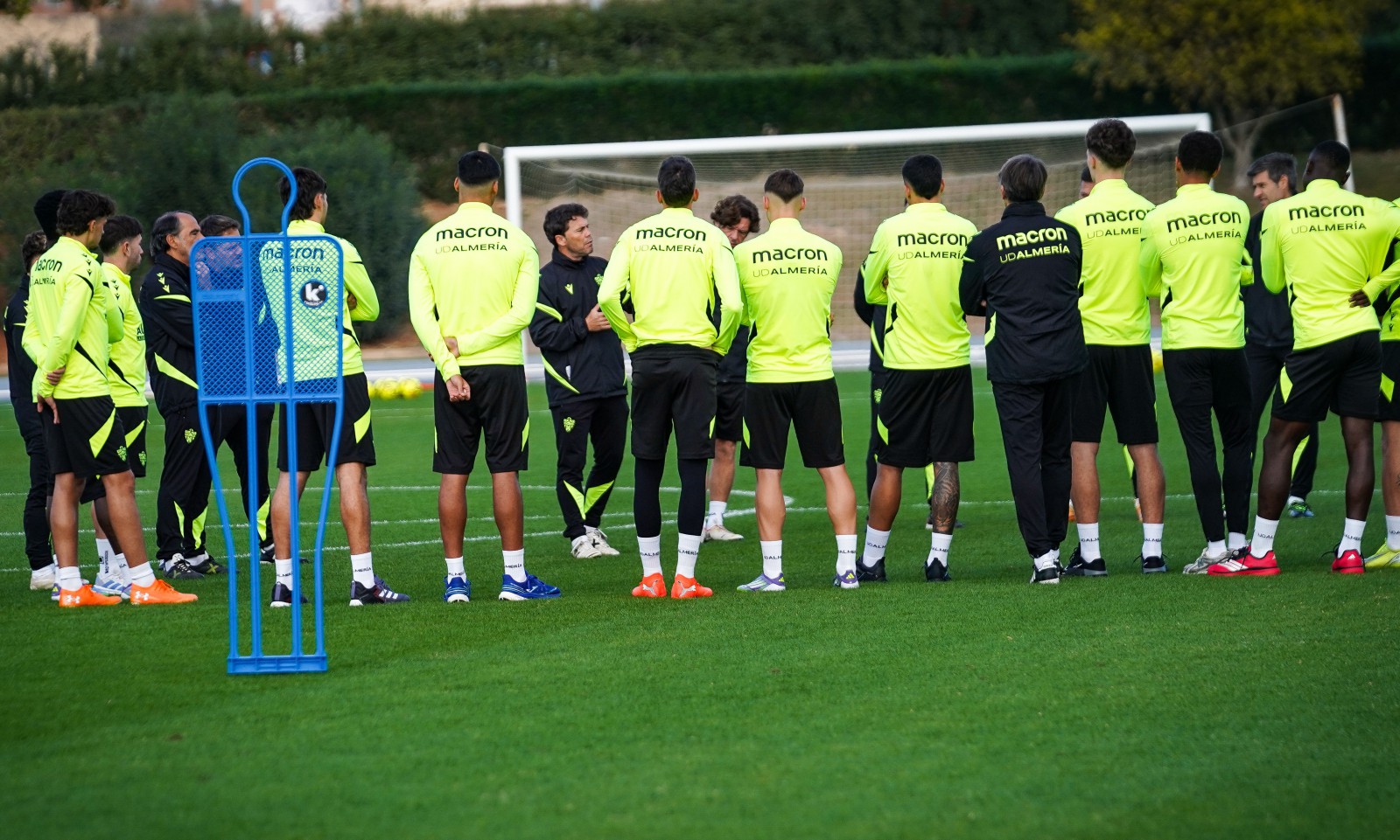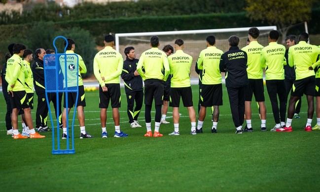 Rubi, el director técnico del Almería, llevó a cabo una charla motivacional con los jugadores antes de iniciar los ejercicios en el Anexo. Todos los futbolistas estuvieron presentes, salvo Soko, quien se ha unido a la selección de Camerún para participar en la próxima Copa África. Sin embargo, durante la sesión, Bonini y Nico Melamed se retiraron hacia la sala médica y al gimnasio debido a sus lesiones, mientras que Robertone y Selvi también están lidiando con algunas molestias.