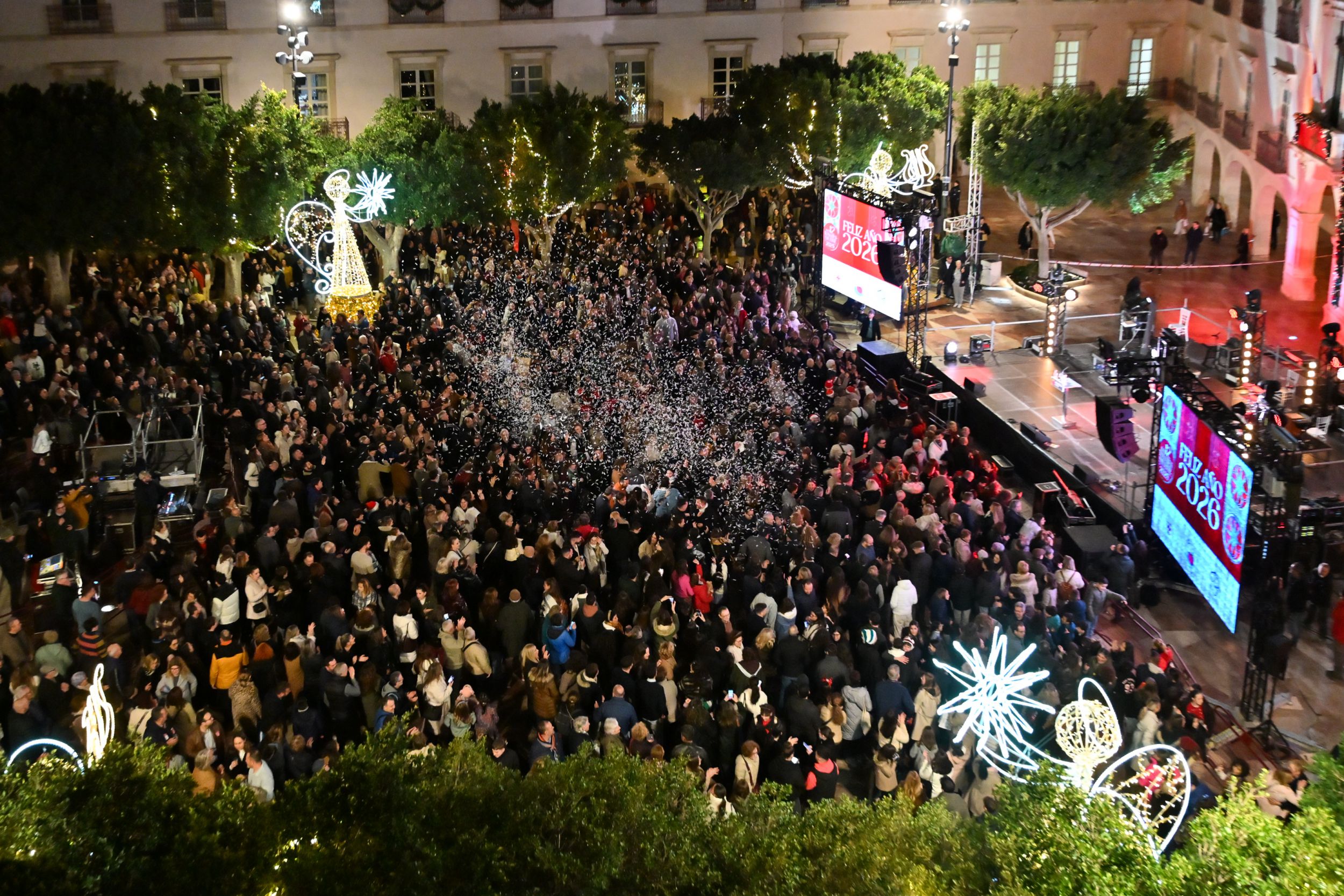 ​La Plaza Vieja de Almería ha acogido esta tarde la segunda edición de ‘Los 12 Tomates de la Suerte’, una cita que se ha consolidado definitivamente dentro de la programación navideña de la capital almeriense. En una jornada marcada por la masiva afluencia de público, la recientemente remodelada Plaza de la Constitución se ha convertido en el punto de encuentro para familias, grupos de amigos y visitantes que han llenado este espacio emblemático para participar en un ensayo simbólico de las campanadas de Año Nuevo. Esta iniciativa, que sustituye las tradicionales uvas por doce tomates cherry, busca rendir homenaje a uno de los productos más representativos de la provincia, reforzando así la identidad agrícola y gastronómica de Almería.
