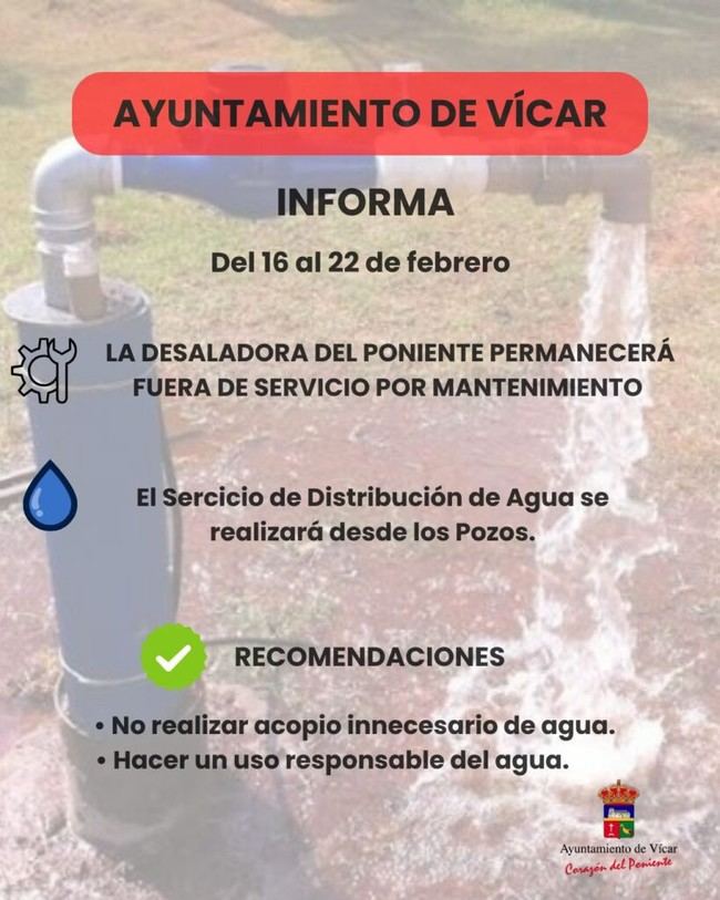 El Ayuntamiento de Vícar ha comunicado a la ciudadanía que el abastecimiento de agua en la localidad está asegurado, incluso con la próxima interrupción del servicio de la Desaladora del Poniente. Esta medida, programada para llevarse a cabo entre el 16 y el 22 de febrero, responde a trabajos de mantenimiento necesarios para garantizar el correcto funcionamiento de esta infraestructura.