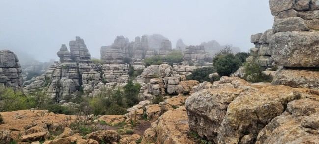 La lluvia que acompañó la jornada otorgó al entorno una atmósfera mágica, realzando las formaciones rocosas caprichosas y los intrincados laberintos de piedra que caracterizan esta zona. Los senderistas caminaron entre crestas, dolinas y agujas esculpidas por la naturaleza a lo largo de milenios, mientras contemplaban vistas panorámicas que incluían la campiña y la ciudad de Antequera al fondo.