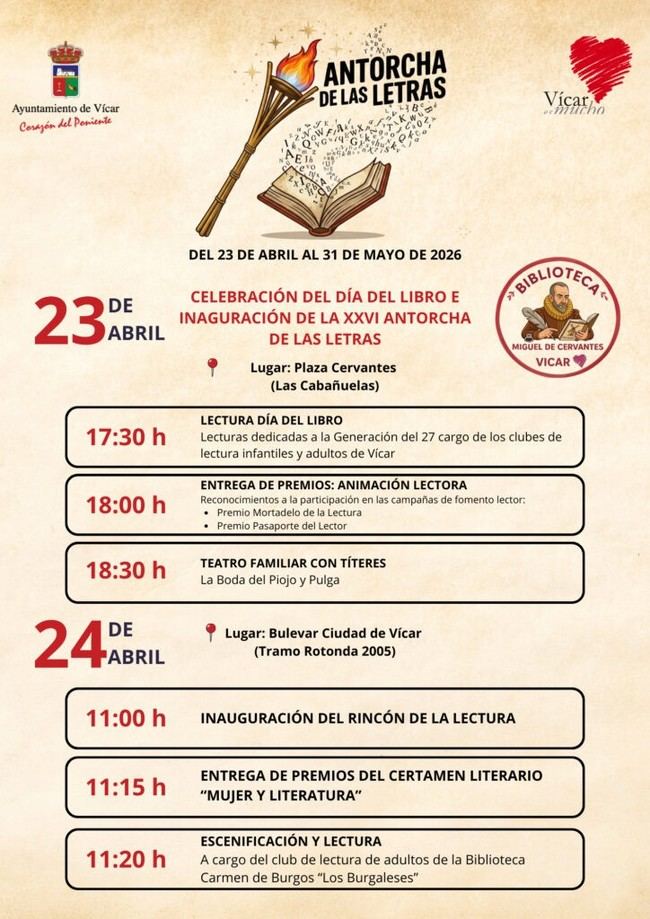 Al día siguiente, se inaugurará un nuevo espacio cultural en el Bulevar Ciudad de Vícar: el Rincón de la Lectura. Este espacio estará dedicado a las artes literarias y servirá como punto de encuentro para los amantes de los libros. La jornada incluirá también la entrega de premios del Certamen Literario “Mujer y Literatura”, así como una escenificación y lectura por parte del club de lectura adultos “Los Burgaleses” de la Biblioteca Carmen de Burgos.