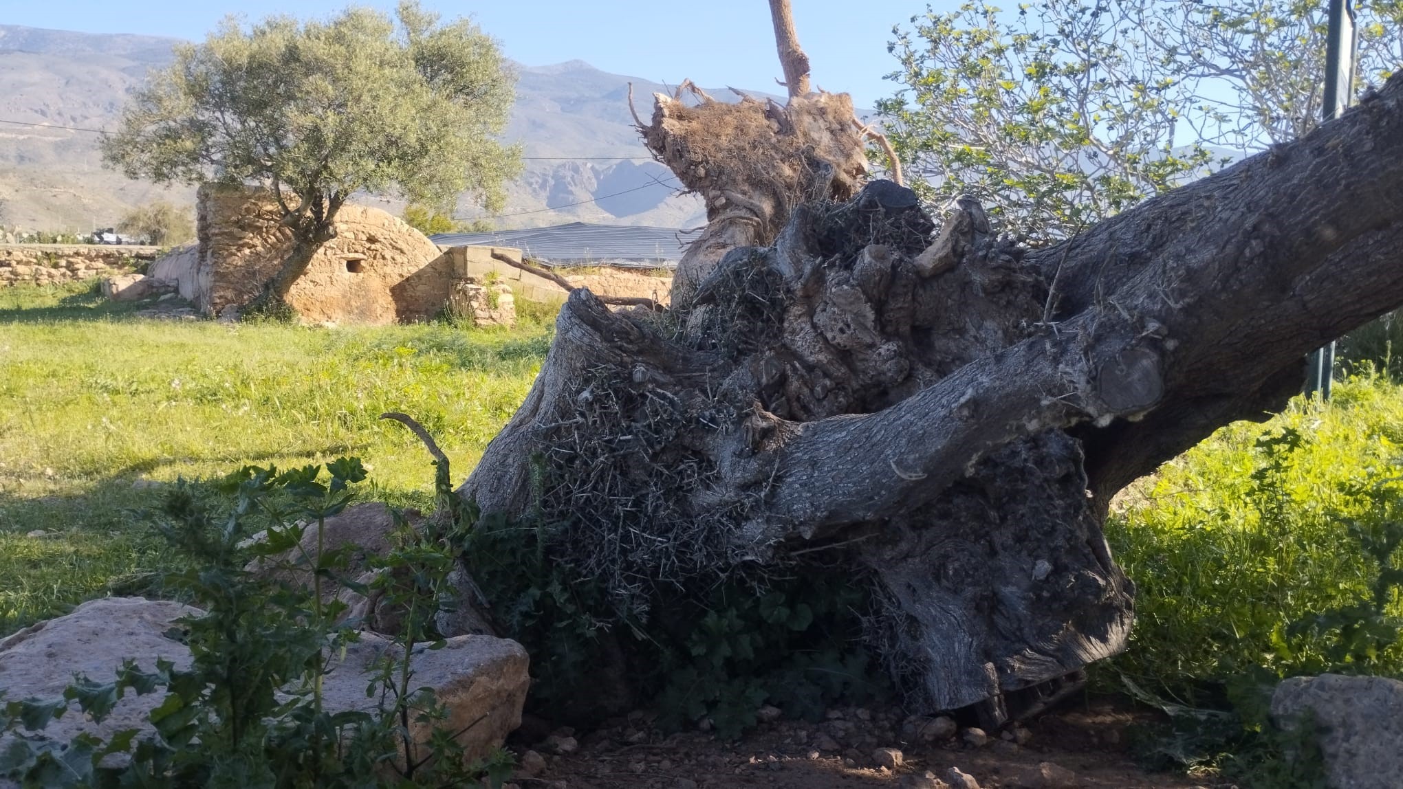 Uso la figura retórica de la prosopopeya para contarles que el viento, suponemos que las rachas huracanadas de febrero que alcanzaron 120 km/h, derribó al centenario Abuelo Acebuche, al que hace cinco años (¡cómo pasa el tiempo!) le dimos cualidades y emociones humanas para relacionar (siempre en mayúsculas) la Paz y la Educación Ambiental.