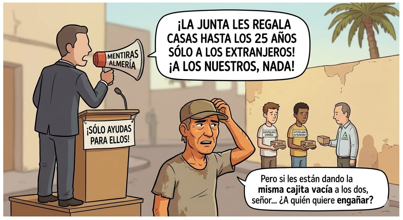 En la provincia de Almería, a pesar del ruido que intenta generar Rodrigo Alonso, no existe un "problema de bandas de menas" ni una alarma social que justifique convertir este tema en el eje central de un programa político. No hay denuncias masivas, no hay conflictos vecinales irresolubles, no hay nada más que una convivencia que, con sus roces lógicos, funciona. Sin embargo, el objetivo es fabricar el conflicto donde solo hay gestión administrativa. Es mucho más sencillo agitar el miedo al "otro" que explicar por qué las políticas de vivienda para la población general siguen siendo insuficientes en todo el Estado.