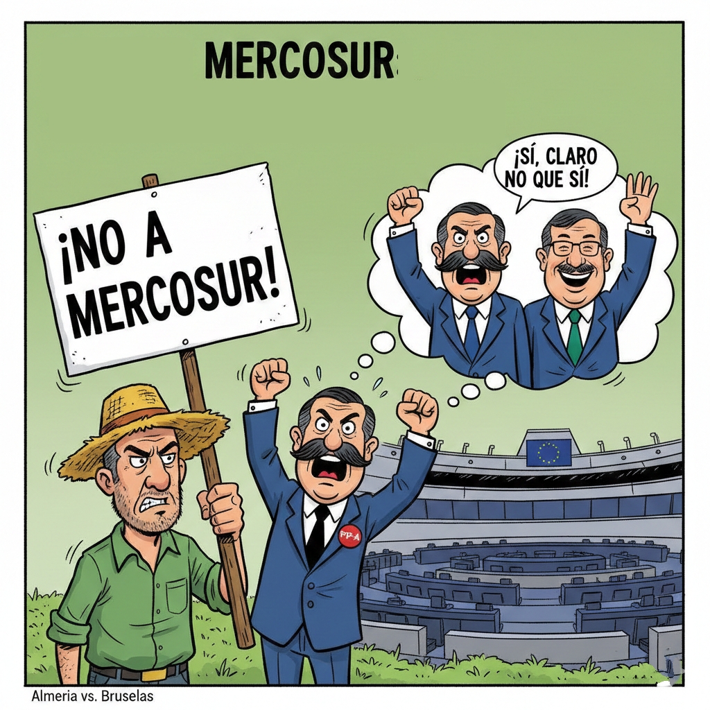 Lo curioso del caso no es la protesta —lícita y previsible—, sino el desdoblamiento de personalidad que sufre el Partido Popular. Por un lado, escuchamos al consejero de Agricultura, el almeriense Ramón Fernández-Pacheco, decir que está "radicalmente en contra" del acuerdo en sus términos actuales. Una firmeza que se contagia a los representantes locales: allí estaban el concejal de Agricultura de la capital, Antonio Urdiales; el alcalde de Níjar, José Francisco Garrido; o el concejal de El Ejido, Manuel Martínez, todos poniendo cara de indignación ante las cámaras mientras señalaban a Madrid y Bruselas.